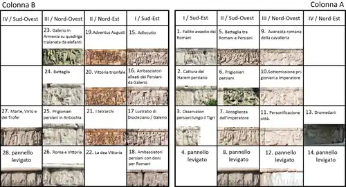Quatre rangées de décorations sculptées superposées ornent chaque pilier. Chaque rangée est séparée des autres par des moulures ouvragées représentant rubans et guirlandes. Une marque identifie le fleuve Tigre. Les panneaux représentent diverses scènes historiques, réalisées cependant avec la plus grande liberté[1]. Ainsi, Galère, le César, est représenté sur l’un des panneaux dans un combat particulier avec le shah sassanide Narseh, bien qu’ils ne se soient jamais rencontrés au cours d’une bataille. Sur l’arc, Galère à cheval attaque avec une lance Narseh, également à cheval, alors qu’un aigle portant dans ses serres la couronne de la victoire s’approche de Galère, fièrement assis sur son cheval, alors que le souverain perse parait près de tomber. Des Perses terrifiés sont foulés par les sabots des chevaux du César dans le désarroi de la bataille, le tout visant manifestement à exalter la puissance de Galère.