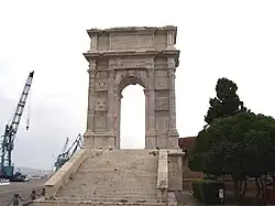 L'arc de Trajan à Ancône est un arc triomphal romain érigé par le Sénat et le peuple de Rome sous le règne de l'empereur Trajan[2]. Il fut construit en l'honneur de cet empereur, après qu'il eut par ses seuls deniers élargi le port de la ville, amélioré les quais et les fortifications. C'est de là que Trajan partit pour la guerre victorieuse contre les Daces[3]. L'arc de Trajan d'Ancône serait l'œuvre de Apollodore de Damas, L'Arco eretto a Nerva Trajano nel porto d'Ancona [4]. Les inscriptions, qui restent lisibles, étaient en bronze, mais cette dorure, ainsi que les frises et les statues, ont été prises par les Sarrasins en 848. La date de construction figure inscrite sur l'arcade ; le texte de l'inscription principale est le suivant[5] :