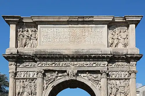 - ↑ Werner Gauer, Zum Bildprogramm des Trajansbogens von Benevent. In Jahrbuch des Deutschen Archäologischen Instituts. Band 89, 1974, p. 308–335.