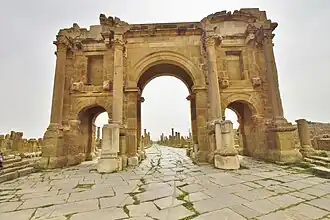L’Arc de Trajan se trouve au nord-est du site[o 1]. C’est le travail de l'architecte Alexandre Lézine qui a fait que l'Arc de Trajan soit oblique par rapport au mur de la ville, une transition était ainsi indiquée entre la perspective de la voie décimane intra muros et l'avenue de Lambèse[o 2]. La large avenue qui passe devant le capitole aboutit au nord à l'Arc de Trajan érigé à l'entrée ouest du decumanus maximus. Peu avant la fin du IIe siècle, la porte utilitaire fut remplacée par un arc de triomphe appelé « arc de Trajan »[o 3].