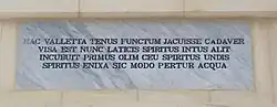 L'aqueduc était transporté par des tuyaux souterrains ou sur une série d'arches en pierre. Pour commémorer la construction de l'aqueduc, l'arche de Wignacourt a été construite à un endroit où l'aqueduc traversait la route menant de La Valette à Mdina. L'arche baroque[2] avait une grande arche au centre et une arche plus petite de chaque côté. Elle était ornée de trois fleurs de lys, d'un relief des armoiries de Wignacourt et de deux plaques de marbre avec des inscriptions latines. La plaque sur le côté faisant face à Santa Venera disait[3],[1] :