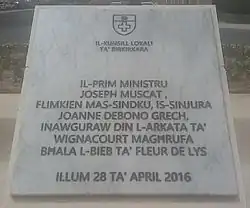 La plaque sur le côté faisant face à Birkirkara disait[1] :