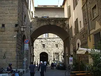 L'arc était une sorte d'accès monumental, comme un pont aérien reliant deux palais. Selon Giorgio Vasari, Paolo Uccello avait peint le côté intérieur de cet arc avec des fresques. Les vestiges étaient encore visibles du temps de Filippo Baldinucci.