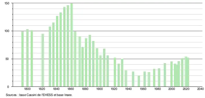 L'évolution du nombre d'habitants est connue à travers les recensements de la population effectués dans la commune depuis 1793. Pour les communes de moins de 10 000 habitants, une enquête de recensement portant sur toute la population est réalisée tous les cinq ans, les populations de référence des années intermédiaires étant quant à elles estimées par interpolation ou extrapolation[13]. Pour la commune, le premier recensement exhaustif entrant dans le cadre du nouveau dispositif a été réalisé en 2004[14].