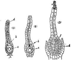 Il est résulté après une série de méioses d'une cellule mère existante dans l'ovule, cette cellule donne le gamétophyte [endosperme], deux gamétanges qui vont donner un archégone où on trouve à l'intérieur une oosphère.