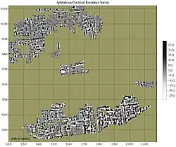 Un exemple de données recueillies dans le domaine archéologique par l'usage de cette technique d'investigation géophysique est fourni par un relevé du site archéologique d'Aphrodisias, en Turquie, effectué dans le cadre d'un programme de recherche parrainé par l'université de New York[9]. L'étude de la résistance électrique de ce site de l'époque hellénistique menée par Lewis Somers, entre 1995 et 1998[10], a couvert environ 20 hectares de terrain non excavé[9], environ 200 000 mètres carrés[10]. L'étude a permis de révéler que le tracé de la ville s'est conformé à suivre un plan en grille et de préciser que dans les zones d'habitation, les îlots urbains, ont une largeur de 35,5 mètres ou 120 pieds ioniques et une longueur de 39,0 mètres ou 132 pieds ioniques[10]. De même, elle a révélé que les places publiques et les bâtiments civils du centre de la ville ont été planifiés selon la même grille, comme le montre très clairement le tracé de l'Agora du Nord (la place publique principale)[10].
