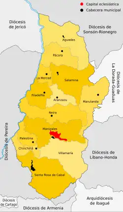 Il comprend les municipalités d'Aguadas, Aranzazu, Chinchiná, Filadelfia, La Merced, Manizales, Marulanda, Neira, Pácora, Palestina, Salamina et Villamaría du département de Caldas et la municipalité de Santa Rosa de Cabal du département de Risaralda ce qui correspond à un territoire de 3 848 km2 divisé en 94 paroisses.