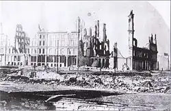 Le feu finit par s'éteindre, aidé en cela par la disparition des vents et une fine pluie qui finit par tomber tard dans la nuit de lundi[19]. L'incendie a brûlé pratiquement 48 blocs, de son point de départ de la maison des O'Leary (au 137 DeKoven Street) jusqu'à Fullerton Avenue au nord, détruisant environ 17 500 bâtiments et réduisant en cendres une surface de 6 kilomètres (4 miles) par 1 kilomètre (3/4 miles), soit environ 9 km2 (2 000 acres)[17]. Dans le centre-ville et les quartiers alentour, il ne reste pratiquement plus de bâtiments qui datent d'avant le Grand incendie[20]. La Chicago Water Tower et la Pumping Station, toutes deux conçues en pierre par l'architecte William W. Boyington en 1869, figurent parmi les rares bâtiments, avec l'église de la Sainte-Famille et l'église Saint-Michel notamment, à avoir survécu à la catastrophe[21],[22].