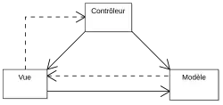 Le patron modèle-vue-contrôleur est un modèle souvent utilisé dans l'architecture de l'interface graphique des logiciels. Il est fait de trois composants : le modèle, la vue et le contrôleur. Le contrôleur prend en charge les opérations effectuées par l'utilisateur à la souris et au clavier, et les transforme en messages destinés au modèle et à la vue. Le modèle stocke les informations à traiter et envoie des messages à la vue lors de modifications. La vue reçoit alors les messages et effectue les modifications nécessaires de l'interface graphique[13].