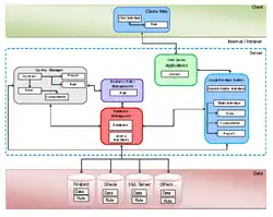 Dans le style dit architecture trois tiers, les composants sont regroupés en trois couches qui concernent respectivement l'affichage sur l'interface graphique, la logique et le stockage en base de données. Chaque couche peut résider sur un ordinateur différent[14].