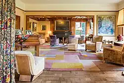 - reliefs géométriques inspirés du répertoire ornemental de l'architecte américain Frank Lloyd Wright[1],[2] :