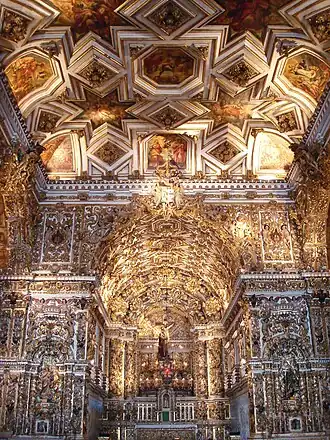 À cette époque, avec des préférences ornementales et dynamiques beaucoup plus marquées que la tradition classique-Renaissance, apparaissent des frontons ornés de volutes et de pinacles, les façades s'animent de nouveaux volumes, de statues, de portiques, de moulures et de reliefs, les ouvertures se diversifient, avec l'apparition de formes en losange, en poire, en ovale, en étoile, etc. Les tours aussi se diversifient, elles peuvent être en retrait de la façade, leur couronnement devient hémisphérique, en escalier ou en bulbe, et peut être recouvert de tuiles colorées[48],[42],[49]. La Cathédrale-basilique de Salvador (pt) est une bonne illustration de la fusion des références classiques, maniéristes et baroques. Le premier temple considéré comme purement baroque est l'église de Santo Antônio (pt) de Cairu[50]. L'église São Francisco (pt) de Salvador, la Capela Dourada de Recife et l'église du Tiers-Ordre de Saint-François-de-la-Pénitence de Rio de Janeiro sont parmi les meilleurs représentants brésiliens du baroque dans toute sa splendeur décorative. Mais, comme nous l'avons déjà dit, il y a toujours eu de nombreuses interpénétrations de différentes tendances stylistiques tout au long de la période coloniale, ce qui rend impossible la définition d'un style cohérent et unifié pour cette période[48],[42].
