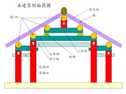 Pour bénéficier d’une surface plus grande, il ne suffit pas de multiplier le nombre de colonnes, il faut aussi couvrir cet espace. La façade suit la panne faîtière du toit à double pente. Pour une surface correspondant à deux colonnes dans la profondeur, une profondeur minimale, la première traverse qui franchit tout cet espace reçoit un poinçon qui supporte la panne faîtière, tandis que les deux poteaux reçoivent chacun une panne sur chacun des longs côtés de la maison, l’ensemble constitue une ferme simplement par une traverse et un poinçon. Plus le poids de la couverture s’élève et plus il est nécessaire d’utiliser des consoles[N 1], éventuellement empilées, pour assurer le lien entre les traverses et les poteaux ou les colonnes. Les colonnes ayant une forte section sont obtenues par l’assemblage de plusieurs pièces accolées. Le caractère modulable de ce principe est évident dans la charpente si l’on augmente la profondeur de la ferme de comble. Le nombre de traverses augmente jusqu’à l’entrait qui est assemblé au poinçon[2] dans le cas d’un temple. Mais dans une construction commune, le poinçon du faîte de la charpente est simplement chevillé à la poutre la plus haute, qui peut ainsi être supportée à ses extrémités par deux autres poinçons chevillés à la poutre inférieure, c’est le tailiang, et ce module peut être repris de chaque côté et couvrir une « travée » supplémentaire, toujours avec ce système de « poinçon ». Tous les assemblages se font par des chevilles. Un arbalétrier peut apparaître dans les édifices de prestige. C’est donc une solution de charpente différente du triangle mécaniquement rigide que l’on trouve en Occident. Ce système permet de donner au toit une forme convexe qui produit un effet de légèreté, mais aussi concave parfois. Les galeries sont protégées par une avancée du toit que permettent de nombreuses variantes de montages, soit avec un poteau supplémentaire et un jeu de traverse et de poinçon, soit avec un porte-à-faux réparti avec l’aide d’une console et du bras levier, ang (qui peut buter contre le dessous d’une traverse), voire au moyen du prolongement d’une traverse ou deux, et des poinçons correspondants[9]. Au cas où les poteaux supportent directement les charges et qu’ils sont simplement solidarisés par les poutres des différents niveaux, pour des toits de fermes par exemple, on appelle ce type de charpente chuandou.