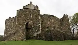 L'Écosse est connue pour ses châteaux spectaculaires dont beaucoup datent de la fin de l'ère médiévale. Les châteaux, dans le sens d'une résidence fortifiée d'un seigneur ou d'un noble, sont arrivés en Écosse dans le cadre de l'encouragement de David Ier des nobles normands et français à s'installer avec des régimes féodaux, en particulier dans le sud et l'est, et étaient un moyen de contrôler les plaines contestées[26],[27],[28]. Il s'agissait principalement de constructions en motte et bailey en bois, d'une monture ou motte surélevée, surmontée d'une tour en bois et d'une plus grande enceinte adjacente ou bailey, toutes deux généralement entourées d'un fossé (fossé) et d'une palissade, et reliées par un pont en bois[29]. Ils variaient en taille, des très grands comme dans la ville d'Inverurie aux modèles plus modestes comme à Balmaclellan[30]. En Angleterre, un grand nombre de ces constructions ont été converties en châteaux de pierre et donjon au XIIe siècle, mais en Ecosse, la plupart de celles qui étaient en occupation continue sont devenues des châteaux de pierre de "l'enceinte " du XIIIe siècle, avec un haut crénelé mur-rideau[29]. Le besoin de murs épais et hauts pour la défense a forcé l'utilisation de méthodes de construction économiques, perpétuant souvent la tradition de la construction en moellons de pierre sèche, qui ont ensuite été recouverts d'un enduit à la chaux, ou harcelés pour l'étanchéité et un aspect uniforme[31]. En plus des châteaux baronniaux, il y avait des châteaux royaux, souvent plus grands et assurant la défense et l'hébergement de la cour écossaise itinérante et un centre administratif local. En 1200, il s'agissait notamment des fortifications d'Ayr et de Berwick[32].