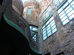 L'École d'Amsterdam fut grandement influencée par l'Expressionnisme et fut caractérisée par l'utilisation de façades arrondies et organiques[39] avec de nombreux éléments purement décoratifs et non-fonctionnels comme des pinacles, des sculptures et des fenêtres à « échelle » (avec des barres horizontales, sorte de réminiscence de barreaux d'échelle). Parfois on considère ce mouvement comme le pendant néerlandais de l'Expressionnisme de brique tant de part et d'autre de la frontière les influences étaient fortes et réciproques.