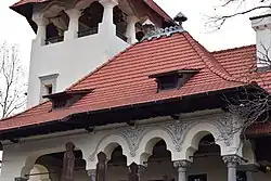 L'architecture néo-roumaine est une renaissance du style Brâncovenesc, un style de l'art et de l'architecture roumains médiévaux, plus précisément en Valachie sous le règne de Constantin Brâncoveanu (1688–1714). Les bâtiments de Brâncovenesc se caractérisent par l'utilisation de portiques en forme de belvédère (principalement les entrées d'églises), d'arcs trilobés ou kokoshnik, de colonnes (généralement corinthiennes) à cannelures torsadées et d'un toit en tuiles céramiques ou métalliques. Les principaux ornements utilisés pour la décoration sont l'entrelacs et le rinceau. Certaines des caractéristiques de l'architecture Brâncovenesc dérivent de l'architecture byzantine et ottomane, et certaines peuvent également être trouvées dans l'architecture russe médiévale.
