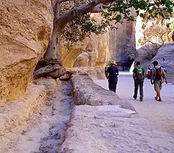 Strabon parle aussi des eaux provenant de sources abondantes : « et la partie intérieure de la ville ayant des sources en abondance, tant pour les besoins domestiques que pour l'arrosage des jardins[47] ». Pour capter l'eau douce des quelques sources disponibles et pour retenir les eaux torrentielles qui se déversent des montagnes dans la vallée de novembre à avril, les habitants y ont érigé au fil des siècles des structures de captage, de stockage et de distribution de ces eaux venues du ciel ou du sous-sol. On trouve ainsi plusieurs arches supportant des aqueducs étroits pour passer d'une falaise à l'autre, sans changer de niveau, et des qanats creusés dans les profondeurs de la montagne[48],[49],[50].