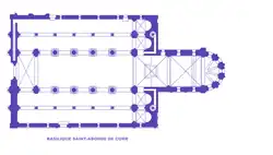 Pour la nef construite vers 1050-1060, l'élévation traditionnelle à deux niveaux est amplifiée par un troisième niveau avec une hauteur totale de 25 m. Des tribunes largement ouvertes sur le vaisseau central sont introduites entre les arcades du rez-de-chaussée et les hautes fenêtres du dernier étage. La stabilité du vaisseau central est assurée par des collatéraux voûtés d'arêtes et son extension aux tribunes est une nouveauté. Le principe de la travée est affirmé par une alternance de piliers forts et faibles et dans une trame sur deux, une colonne engagée monte jusqu'au niveau de la charpente. Ces piles sont composées d'un noyau carré et de quatre colonnes engagées et parfaitement coordonnées aux retombées comme dans les édifices entièrement voûtés. Ainsi au début de l'art roman, pour la travée, articulation essentielle de l'architecture médiévale, l'architecture voûtée et l'architecture charpentée participent à la définition d'une nouvelle plastique murale.