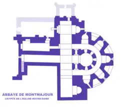 La réponse au problème d'une circulation indépendante des fidèles pour accéder aux reliques passe par la création d'un déambulatoire autour du chœur isolant les célébrations de l'autel majeur et permettant de distribuer des absidioles rayonnantes avec des autels secondaires. Si l'exemple de la cathédrale de Clermont-Ferrand qui a servi de modèle à la collégiale Saint-Aignan d'Orléans n'est connu que par des fouilles, sa crypte est une ébauche de celle de l'église Saint-Philibert de Tournus consacrée en 1019 dont le chevet est en partie encore existant. Il est construit sur une crypte de même plan où le chœur et l'abside sont ceinturées par un déambulatoire desservant des chapelles quadrangulaires.