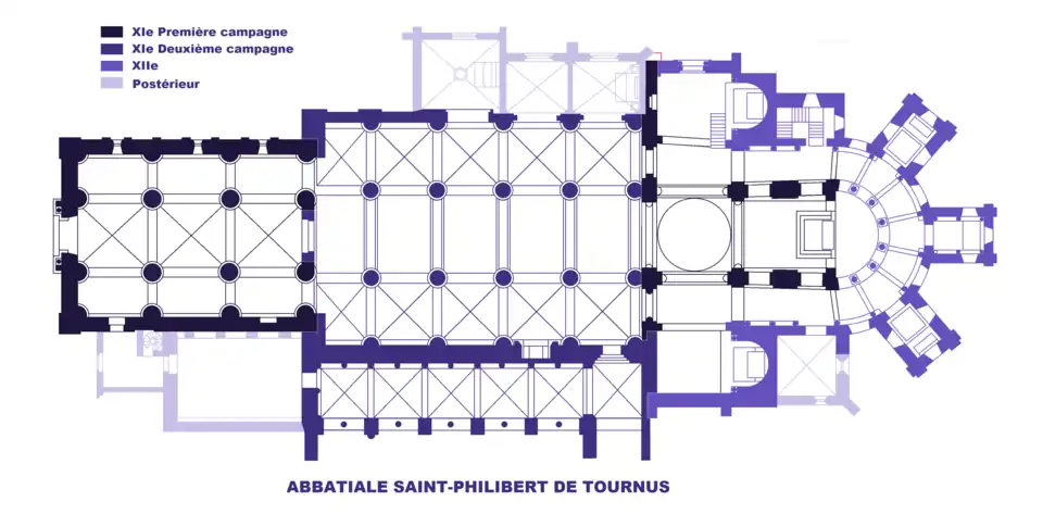 À l'abbaye Saint-Philibert de Tournus, la galilée construite vers 1035-1040 est le premier témoin de ce type. Elle s'inscrit dans la suite des massifs de façade carolingiens avec un sanctuaire souvent dédié à saint Michel au-dessus d'une salle basse. Le plan basilical présente vingt mètres de longueur par dix-sept de largeur, sur deux niveaux, une nef de trois travées et des collatéraux. Au rez-de-chaussée, le vaisseau central est vouté d'arêtes et les collatéraux de berceaux transversaux. À l'étage, la nef centrale haute de 12,50 m est voutée en berceau et contrebutée de chaque côté par des voûtes en demi-berceau[29].