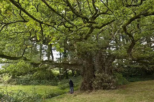 - ↑ Appelé localement « Ar Ven Der » (« l'arbre chêne »), ce chêne pédonculé a un âge estimé entre 800 (selon Drénou) et 1200 ans (selon Ted Green (en)).
