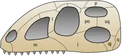 - existence d'une fenêtre latéro-postérieure, sur la mandibule, bien visible chez les crocodiliens, absente chez certains oiseaux ;
