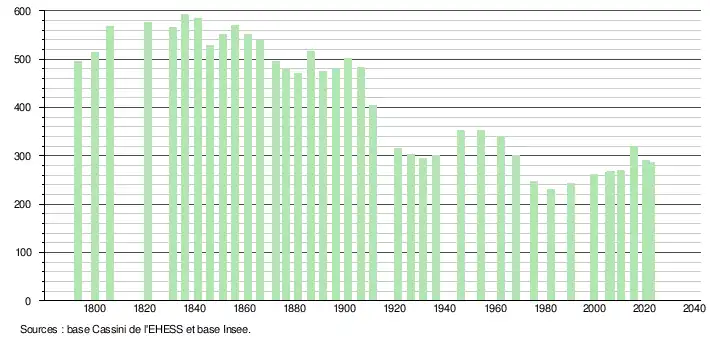 L'évolution du nombre d'habitants est connue à travers les recensements de la population effectués dans la commune depuis 1793. Pour les communes de moins de 10 000 habitants, une enquête de recensement portant sur toute la population est réalisée tous les cinq ans, les populations de référence des années intermédiaires étant quant à elles estimées par interpolation ou extrapolation[27]. Pour la commune, le premier recensement exhaustif entrant dans le cadre du nouveau dispositif a été réalisé en 2005[28].
