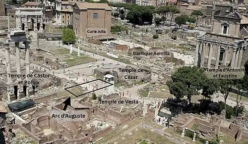 Il est situé entre le temple de Castor et Pollux et le temple de César, accolé à ce dernier (« iuxta aedem divi Iulii »[a 1])[1]. Il sert alors d'entrée monumentale au Forum Romain pour ceux qui viennent du Vicus Vestæ[2] (voir le plan).