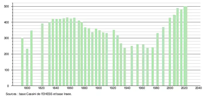L'évolution du nombre d'habitants est connue à travers les recensements de la population effectués dans la commune depuis 1793. Pour les communes de moins de 10 000 habitants, une enquête de recensement portant sur toute la population est réalisée tous les cinq ans, les populations de référence des années intermédiaires étant quant à elles estimées par interpolation ou extrapolation[17]. Pour la commune, le premier recensement exhaustif entrant dans le cadre du nouveau dispositif a été réalisé en 2005[18].