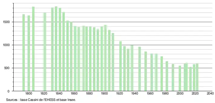 En 2022, la commune comptait 599 habitants[Note 3], en évolution de +11,34 % par rapport à 2016 (Puy-de-Dôme : +2,1 %, France hors Mayotte : +2,11 %).