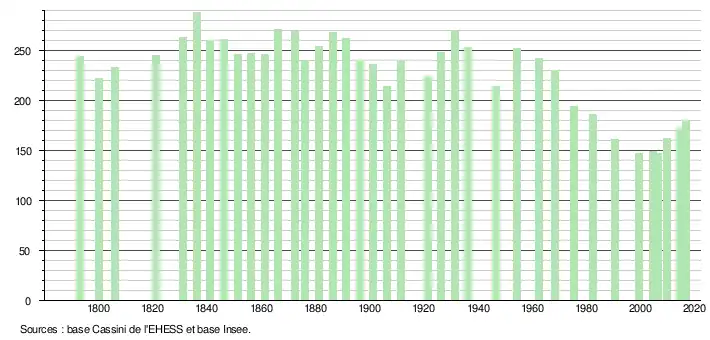 L'évolution du nombre d'habitants est connue à travers les recensements de la population effectués dans la commune depuis 1793. Pour les communes de moins de 10 000 habitants, une enquête de recensement portant sur toute la population est réalisée tous les cinq ans, les populations de référence des années intermédiaires étant quant à elles estimées par interpolation ou extrapolation[6]. Pour la commune, le premier recensement exhaustif entrant dans le cadre du nouveau dispositif a été réalisé en 2004[7].