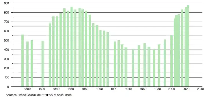 L'évolution du nombre d'habitants est connue à travers les recensements de la population effectués dans la commune depuis 1793. Pour les communes de moins de 10 000 habitants, une enquête de recensement portant sur toute la population est réalisée tous les cinq ans, les populations de référence des années intermédiaires étant quant à elles estimées par interpolation ou extrapolation[15]. Pour la commune, le premier recensement exhaustif entrant dans le cadre du nouveau dispositif a été réalisé en 2004[16].