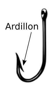 L'ardillon est, sur les hameçons, la contre-pointe empêchant le poisson de se décrocher. Il s'agit alors d'hameçons à pointe barbelée ou d'hameçons barbelés.