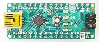 L' Arduino Nano est une carte microcontrôleur open source compatible avec les platines d'expérimentation, basée sur le microcontrôleur (MCU) Microchip ATmega328P et développée par Arduino.cc et initialement publiée en 2008. Il offre la même connectivité et les mêmes spécifications que la carte Arduino Uno dans un format plus petit[en 1].