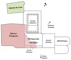 À l'est du portique des Danaïdes, un second portique donne accès à la bibliothèque qui est divisée en deux grands halls, chacun prolongé par une abside. L'un est consacré aux ouvrages des auteurs latins et l'autre aux ouvrages des auteurs grecs. Les murs sont décorés de colonnes entre lesquelles ont été placés des portraits d'écrivains célèbres[2]. La bibliothèque est détruite lors de l'incendie de 64 et restaurée sous Domitien. Le Sénat s'y réunit parfois.