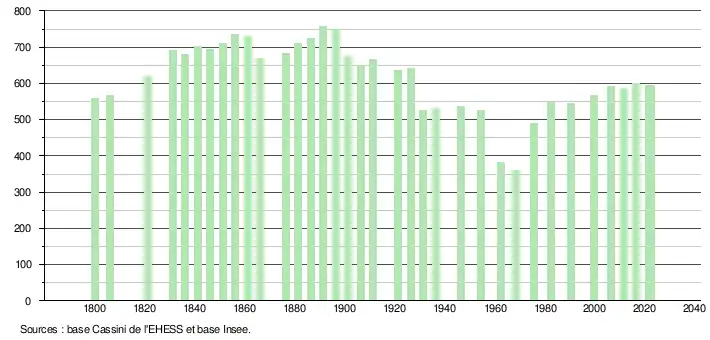 L'évolution du nombre d'habitants est connue à travers les recensements de la population effectués dans la commune depuis 1800. Pour les communes de moins de 10 000 habitants, une enquête de recensement portant sur toute la population est réalisée tous les cinq ans, les populations de référence des années intermédiaires étant quant à elles estimées par interpolation ou extrapolation[12]. Pour la commune, le premier recensement exhaustif entrant dans le cadre du nouveau dispositif a été réalisé en 2006[13].