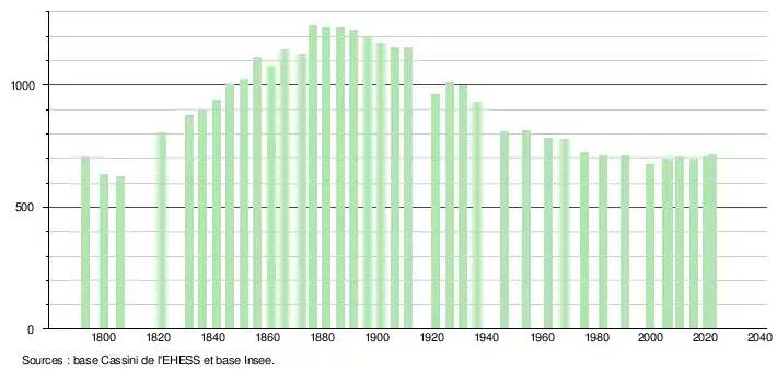 | L'évolution du nombre d'habitants est connue à travers les recensements de la population effectués dans la commune depuis 1793. Pour les communes de moins de 10 000 habitants, une enquête de recensement portant sur toute la population est réalisée tous les cinq ans, les populations de référence des années intermédiaires étant quant à elles estimées par interpolation ou extrapolation[25]. Pour la commune, le premier recensement exhaustif entrant dans le cadre du nouveau dispositif a été réalisé en 2005[26]. En 2022, la commune comptait 713 habitants[Note 2], en évolution de +3,18 % par rapport à 2016 (Landes : +5,78 %, France hors Mayotte : +2,11 %). |