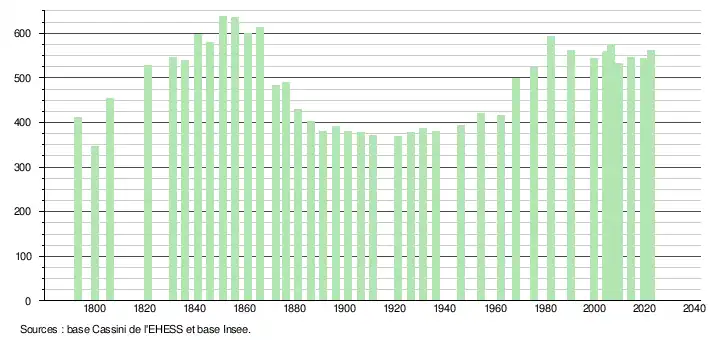 L'évolution du nombre d'habitants est connue à travers les recensements de la population effectués dans la commune depuis 1793. Pour les communes de moins de 10 000 habitants, une enquête de recensement portant sur toute la population est réalisée tous les cinq ans, les populations de référence des années intermédiaires étant quant à elles estimées par interpolation ou extrapolation[26]. Pour la commune, le premier recensement exhaustif entrant dans le cadre du nouveau dispositif a été réalisé en 2004[27].