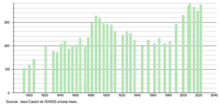 L'évolution du nombre d'habitants est connue à travers les recensements de la population effectués dans la commune depuis 1793. Pour les communes de moins de 10 000 habitants, une enquête de recensement portant sur toute la population est réalisée tous les cinq ans, les populations de référence des années intermédiaires étant quant à elles estimées par interpolation ou extrapolation[25]. Pour la commune, le premier recensement exhaustif entrant dans le cadre du nouveau dispositif a été réalisé en 2008[26].