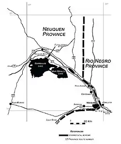 , consulté le ) - ↑ M.L. Sanchez, J.O. Calvo et S. Heredia, « Paleoambientes de sedimentación del tramo superior de la Formación Portezuelo, Grupo Neuquén (Cretácico Superior), Los Barreales, provincia del Neuquén » [« Paleoenvironment from sediments of the upper section of the Portezuelo Formation, Neuquén Group (Upper Cretaceous), Los Barreales, province of Neuquén »], Revista de la Asociación Geológica Argentina (Magazine of the Geological Association of Argentina), vol. 60, no 1, (ISSN 1851-8249, lire en ligne)