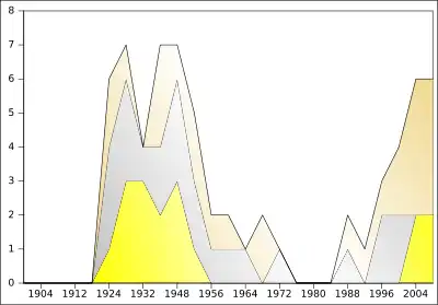 | 1932 | 3 | 1 | 0 | 4 | 11 |