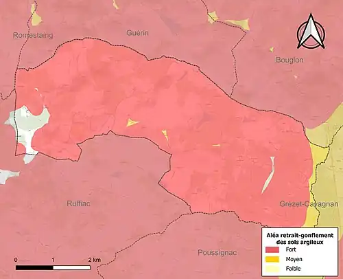 Le retrait-gonflement des sols argileux est susceptible d'engendrer des dommages importants aux bâtiments en cas d’alternance de périodes de sécheresse et de pluie[19]. 97 % de la superficie communale est en aléa moyen ou fort (91,8 % au niveau départemental et 48,5 % au niveau national)[Carte 2]. Depuis le , en application de la loi ELAN, différentes contraintes s'imposent aux vendeurs, maîtres d'ouvrages ou constructeurs de biens situés dans une zone classée en aléa moyen ou fort[Note 2],[20].