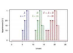 Intuitivement, ajouter, soustraire, multiplier ou diviser deux nombres flous nécessite de calculer la fonction d'appartenance associée au résultat (un autre nombre flou). À titre d'exemple, on s'intéresse ici à l'expression arithmétique et sont deux nombres flous, dont les fonctions d'appartenances sont illustrées sur la figure 4 ci-contre. Leurs fonctions d'appartenance sont respectivement définies par :