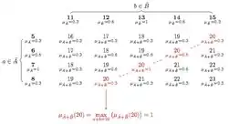 Pour calculer le degré d'appartenance de 18 à l'ensemble flou , il est nécessaire de construire tous les couples de valeurs tels que , et où . En effet, cinq couples voient leur somme égale à 18 et tous peuvent donc être à l'origine de ce résultat. De manière logique, on peut donc écrire :