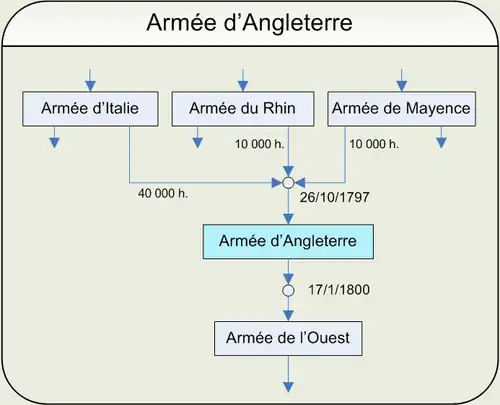 - Le 5 brumaire an VI () le Directoire décida le rassemblement d’une nouvelle armée dans le but d'envahir la Grande-Bretagne. À la fin de décembre, cette armée n'était pas réunie, mais 40 000 hommes tirés de l'armée d'Italie, et 10 000 pris dans les armées du Rhin et de Mayence avaient l'ordre de se concentrer sur son arrondissement. Napoléon Bonaparte fut désigné comme général en chef de cette armée, et, en l'attendant, le général Desaix, commandant par intérim, était à Paris.