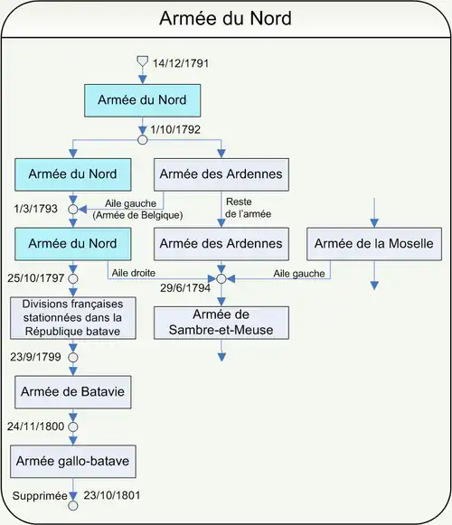• Elle fut créée par ordre du roi le , puis séparée en armée du Nord et armée des Ardennes par décret de la Convention du .