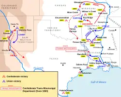 La Confédération détacha le Département du Trans-Mississippi de son Département de l'Ouest le 26 mai 1862. Il était principalement composé des quatre États confédérés situés à l'est du fleuve Mississippi (Texas, Louisiane, Arkansas, et Missouri) et incluait deux territoires confédérés, le territoire indien et l'Arizona confédéré, couvrant approximativement les États actuels de l'Oklahoma), du Nouveau-Mexique et de l'Arizona. Le commandement de la zone fut confié au major-général T. H. Holmes[2]. Le Trans-Mississippi vit se dérouler de nombreuses opérations menées par des forces autonomes, comme celles de Sterling Price, William Quantrill ou, au Missouri, les francs-tireurs rebelles appelés bushwhackers.