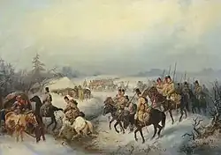 La campagne de Russie de 1812 est une campagne militaire menée par l’empereur Napoléon, alors au sommet de sa puissance. La Russie est la dernière grande puissance d'Europe continentale qui refuse de se joindre au blocus continental contre le Royaume-Uni. Napoléon n'envisage pas au départ la conquête de la Russie mais espère que des victoires sur les armées russes dans les régions frontalières amèneront le tsar à se soumettre : cependant, le feld-maréchal Michel Barclay de Tolly, à la tête d'une armée russe inférieure en nombre, refuse la bataille décisive contre la Grande Armée ; il se replie jusqu'à Smolensk tout en pratiquant la tactique de la terre brûlée. Le tsar le remplace alors par Mikhaïl Koutouzov qui livre la bataille indécise de la Moskova avant d'abandonner Moscou, évacuée et incendiée par les Russes avant son occupation par les Français. La Grande Armée, trop nombreuse pour se loger et se nourrir, encombrée d'une masse de butin inutile, voit ses communications harcelées par les cosaques et les bandes de paysans dressés contre l'envahisseur. La retraite française dans le froid de l'automne russe décime les forces qui restent à Napoléon.