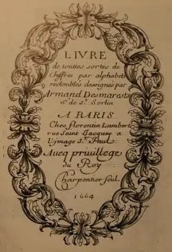 - Livre de toutes sortes de chiffres par alphabets redoublés dessignés par Armand Desmarets, Sr de St Sorlin. Paris : Florentin Lambert en 1664 (grav. par Charpentier). 8°, 100 pl. gr. (Rouen BM). Cat. Destailleur n° 903, Cat. Jammes n° 26.