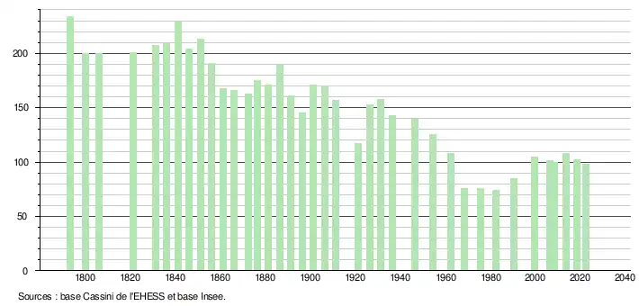 L'évolution du nombre d'habitants est connue à travers les recensements de la population effectués dans la commune depuis 1793. Pour les communes de moins de 10 000 habitants, une enquête de recensement portant sur toute la population est réalisée tous les cinq ans, les populations de référence des années intermédiaires étant quant à elles estimées par interpolation ou extrapolation[21]. Pour la commune, le premier recensement exhaustif entrant dans le cadre du nouveau dispositif a été réalisé en 2008[22].